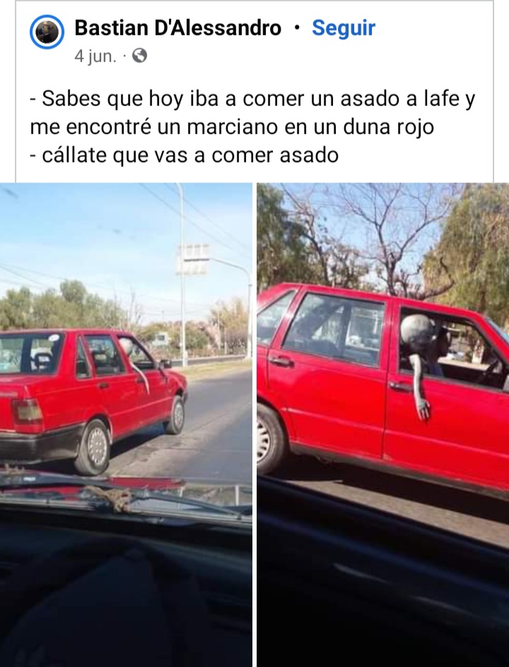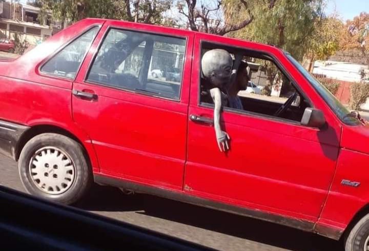 Se hizo viral unas imágenes en las que se puede ver una forma similar a un extraterrestre en el asiento de acompañante de un Fiat Duna rojo, que era conducido por un vecino, en la localidad de Laferrere, partido de La Matanza.