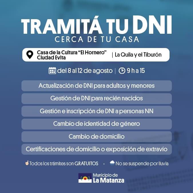 El operativo se realizará en la Casa de la Cultura «El Hornero», ubicado en la intersección de la calle La Quila y El Tiburón, localidad de Ciudad Evita, partido de La Matanza. Funcionará de 9 a 15hs.