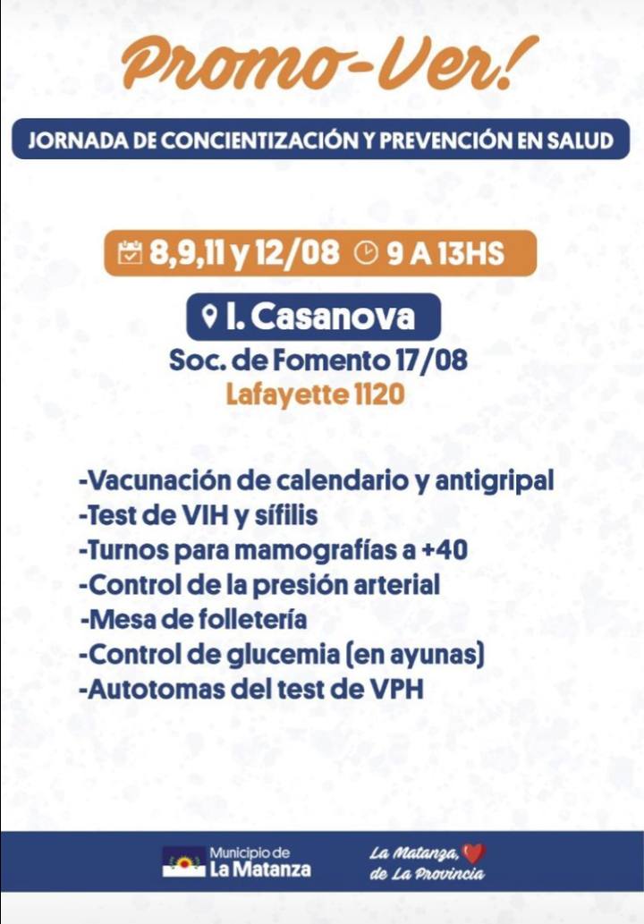 Esta semana llega a la localidad de Isidro Casanova el programa el programa Promo-Ver de la Secretaria de Salud del municipio de La Matanza.