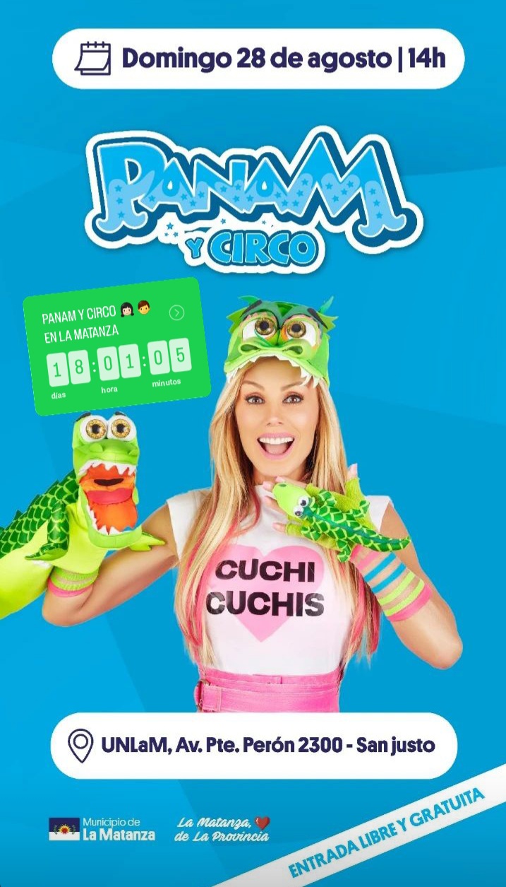 La reconocida artista infantil Panam se presentará en el predio del estacionamiento de la Universidad Nacional de La Matanza, ubicada en la calle Florencio Varela 2300, localidad de San Justo, partido de La Matanza.
