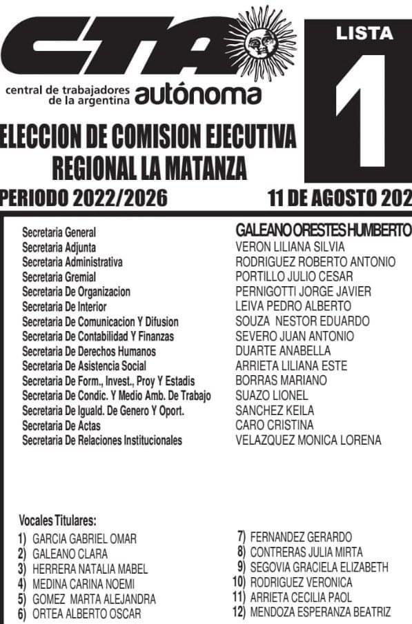 En La Matanza consagraron a Orestes “Beto” Galeano como Secretario General y Liliana Silvia Verón como secretaria adjunta, mientras que en la Provincia De Buenos Aires gano Oscar de Isasi como secretario General y Nadia Belén Trinchero como adjunta y a nivel Nacional a Hugo “Cachorro” Godoy como Secretario Nacional y Ricardo Peidró como secretario Adjunto.