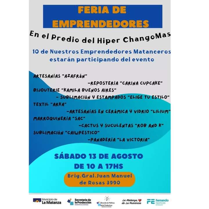 En el día de hoy se llevará a cabo una gran feria de emprendedores en el Predio del Hiper ChangoMas, donde participarán más de 40 emprendedores, 10 de los cuales son matanceros.