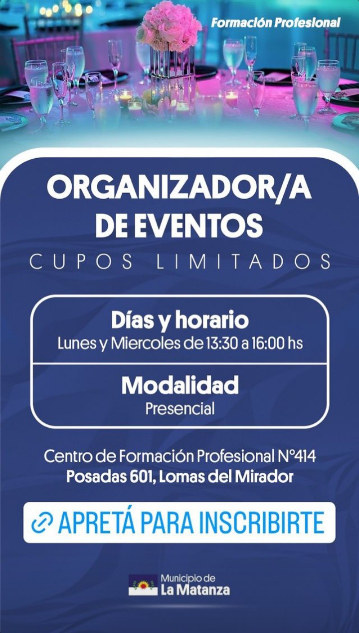 La Secretaría de Trabajo del Municipio de La Matanza informó que se llevará a cabo un curso de Organizador de Eventos bajo la modalidad presencial.