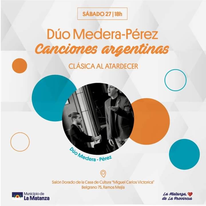 El ciclo Clásica al Atardecer de la Secretaría de Cultura y Educación del municipio de La Matanza invita a presenciar la presentación Canciones Argentinas del Dúo Medera-Pérez.