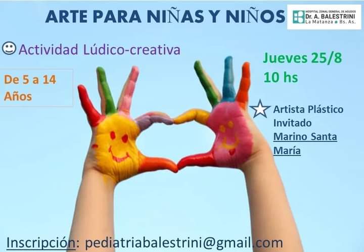 El servicio de Pediatría del nosocomio Balestrini, de la localidad de Ciudad Evita, realizará el día jueves 25 de agosto a las 10 hs. una actividad lúdico-creativa destinada a niñas y niños de 5 a 14 años.