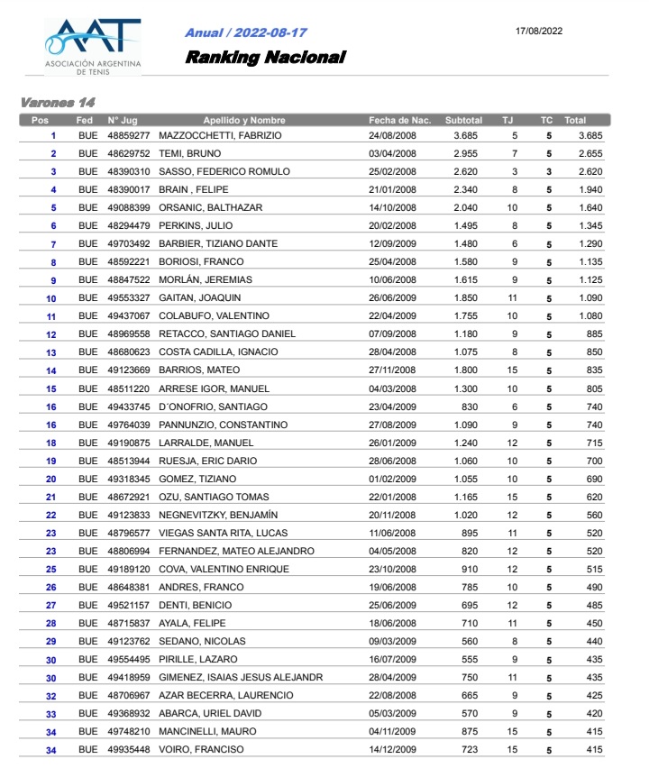 Sus logros lo posicionaron como N°1 en todas las categorías: Ranking Federado Sub 10- Puesto 1/ Sub 12-Puesto 1/ Sub 14- Puesto 1.