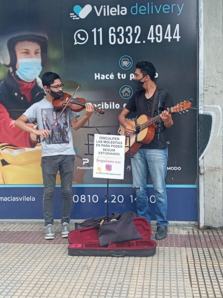 «Disculpen las molestias, es para poder seguir estudiando», se lee en el cartel que exhiben y llevan consigo, hace cinco años, los hermanos Tomás (21) y Agustín (24) Ojeda cuando se ubican en la peatonal Arieta de la localidad de San Justo, en el Partido de La Matanza. Con un violín y una guitarra, musicalizan la estadía de los paseantes.