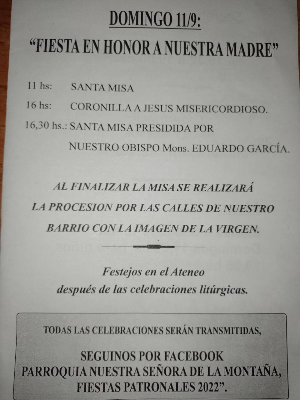 El evento de honor se realizará el domingo 11 de septiembre y comenzará con una santa misa a partir de las 11hs