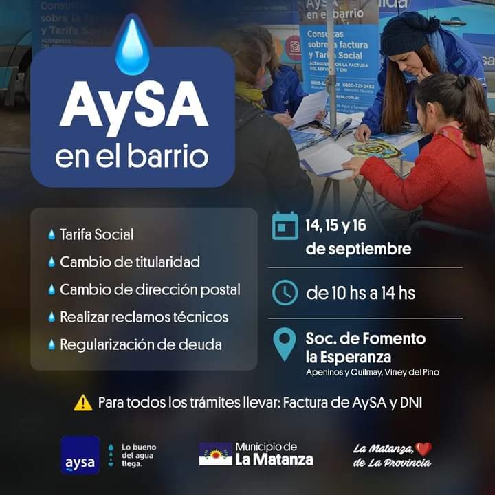 Este 15 y 16 de septiembre habrá Oficinas Móviles de AYSA en la localidad de Virrey del Pino, dónde los vecinos podrán gestionar la Tarifa Social de agua, realizar reclamos, consultas y otros trámites.