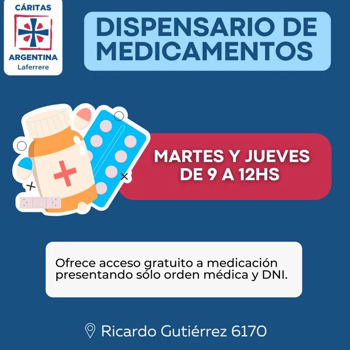 Cáritas Laferrere informó que lleva a cabo un dispensario que entrega medicamentos en forma gratuita los días martes y jueves de 09 a 12 hs, en su sede ubicada en Ricardo Gutiérrez 6170.