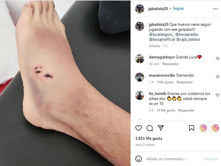 La imagen que publicó el doctor José Batista en su cuenta de Instagram se volvió viral. Se puede ver cómo le quedó al tobillo al jugador. Hinchado y con las marcas de los tapones del adversario son las muestras del impacto que padeció. Junto a foto escribió: “¡Qué huevos nene, seguir jugando con ese golpazo!”.