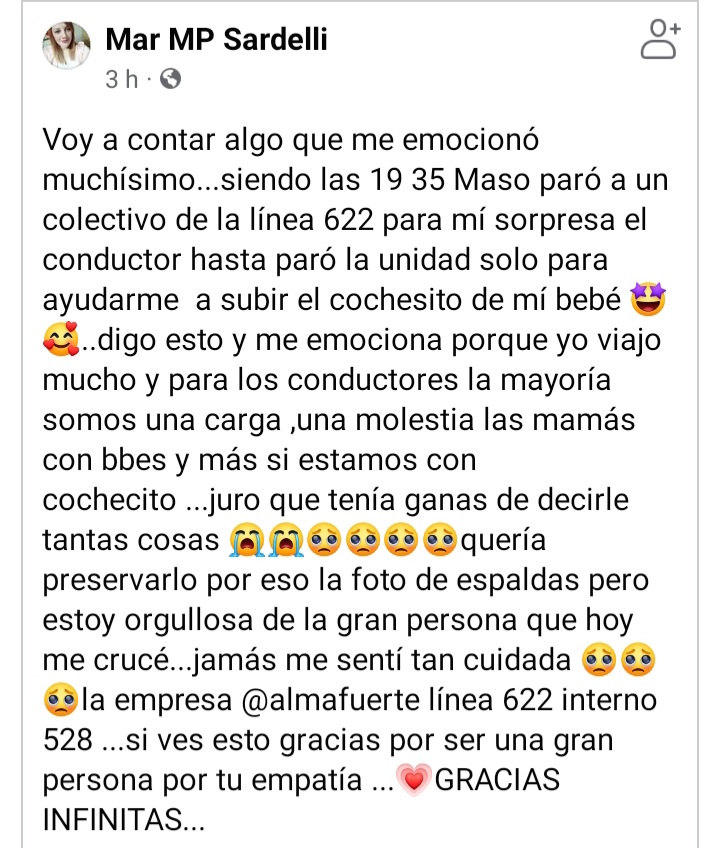 Siendo las 19:35hs del día jueves, la vecina que esperaba el colectivo se sorprendió del gesto del chófer de la línea 622 interno 528, que frenó la unidad y la ayudó a subir el chochesito de su bebé.