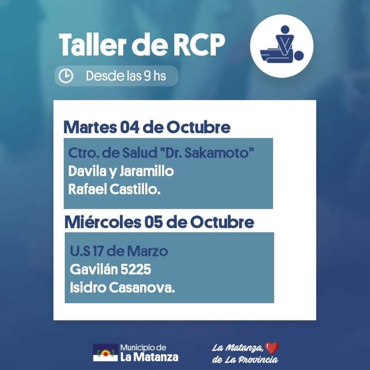 La Secretaría de Salud del municipio de La Matanza informó que el miércoles 05 de octubre a partir de las 09:00hs se realizarán talleres de RCP abiertos a la comunidad en Casanova.