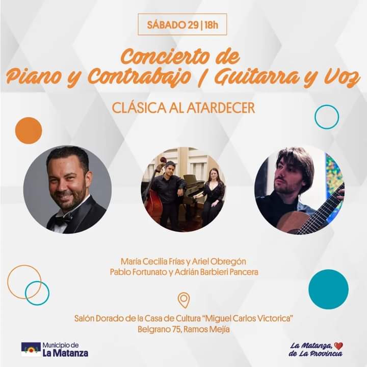 El Ciclo Clásica al Atardecer de la Secretaría de Cultura y Educación presentará Concierto de Piano y Contrabajo, y Guitarra y Voz.