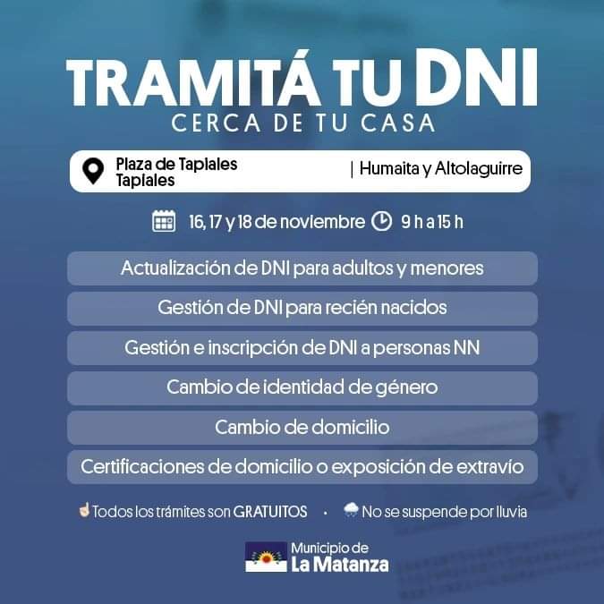 El municipio de La Matanza en conjunto con la Secretaría de Coordinación e Innovación informaron que este miércoles 16, jueves 17 y viernes 18 de noviembre, se llevará a cabo un operativo de Documentación en la localidad de Tapiales.