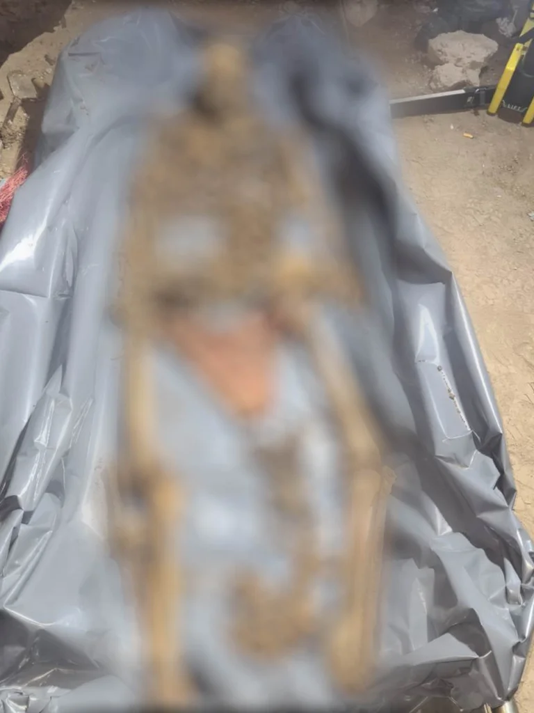De esta forma, Medone envió de inmediato efectivos policiales, peritos de la Policía Científica y Bomberos a la casa de la familia. Allí comenzaron a cavar y se encontraron con el horror: primero con un cráneo. Siguieron excavando y hallaron un cuchillo y presumiblemente restos de ropa, que la hija de Reynoso reconoció como propiedad de su madre. Por último, los forenses recuperaron el 90% de un esqueleto, que se presume es de una mujer. El cráneo tiene un impacto claramente visible, un hueco que se presume sería producto de un golpe con un objeto contundente.