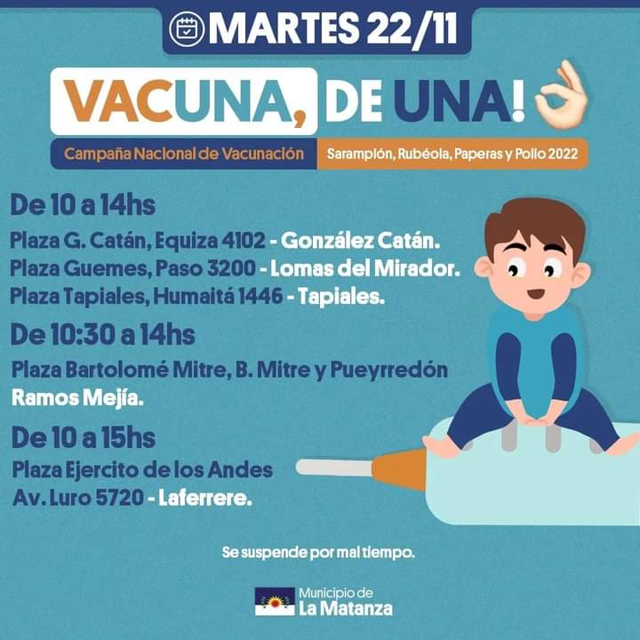 La Secretaría de Salud del Municipio de La Matanza informó que este martes 22 de noviembre se continuará con la Campaña Nacional de Vacunación contra el Sarampión, Rubéola, Paperas y Polio en diferentes puntos de Matanza.