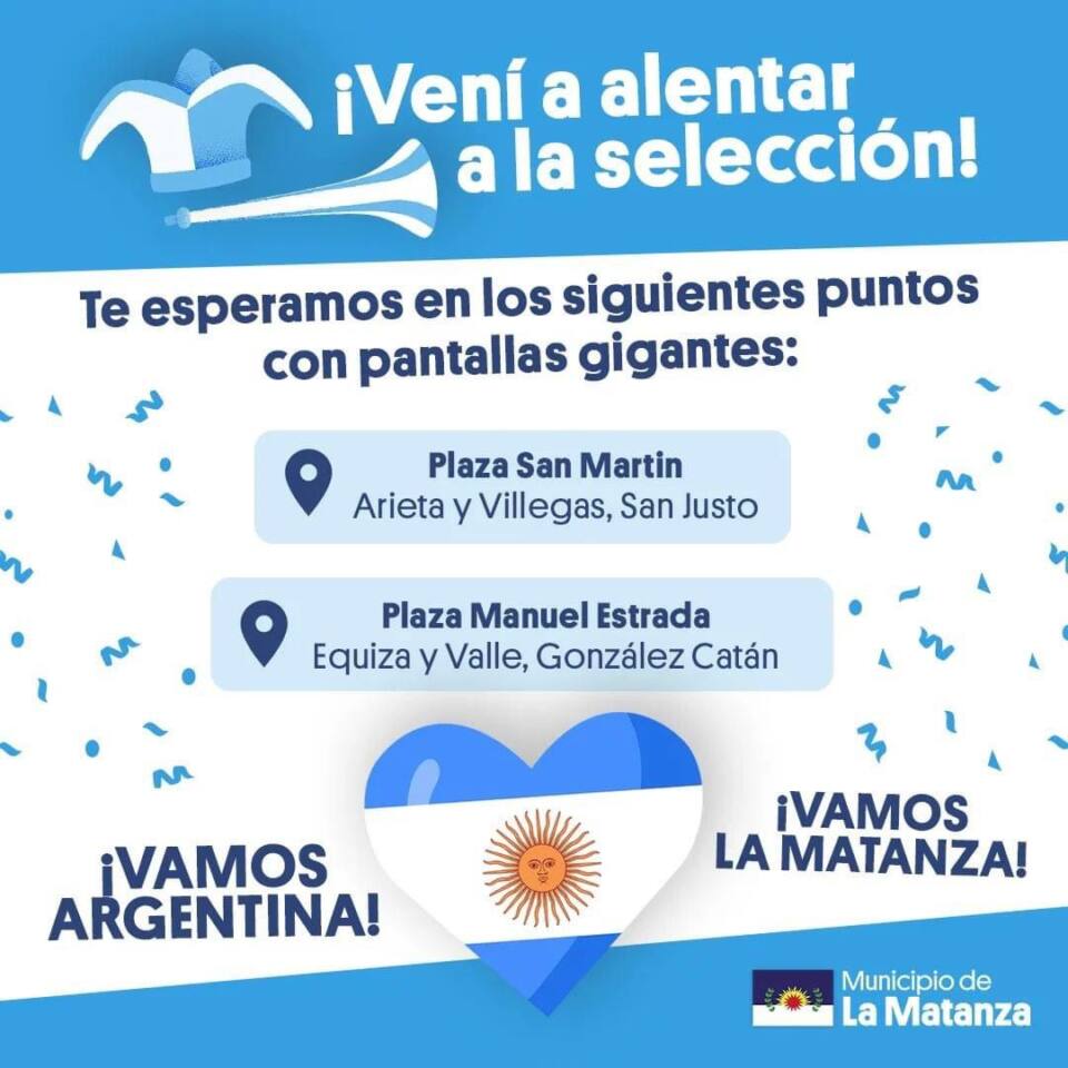 La Selección nos necesita más que nunca, es por ello que el Municipio de La Matanza habilitará plazas con pantallas grandes para ver uno de los partidos más importantes de Qatar 2022
