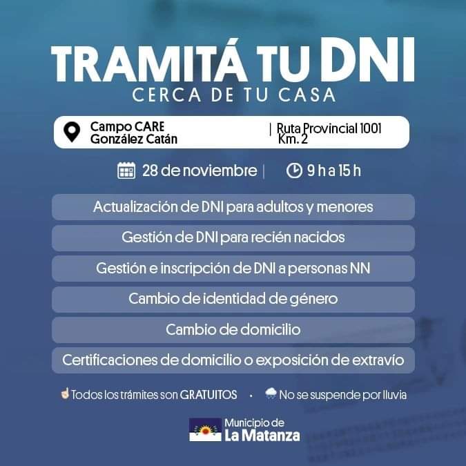 El operativo se realizará en el Campo CARE, Ruta Provincial 1001, Km. 2, González Catán. En el horario de 9 a 15 horas. Todos los trámites son gratuitos.