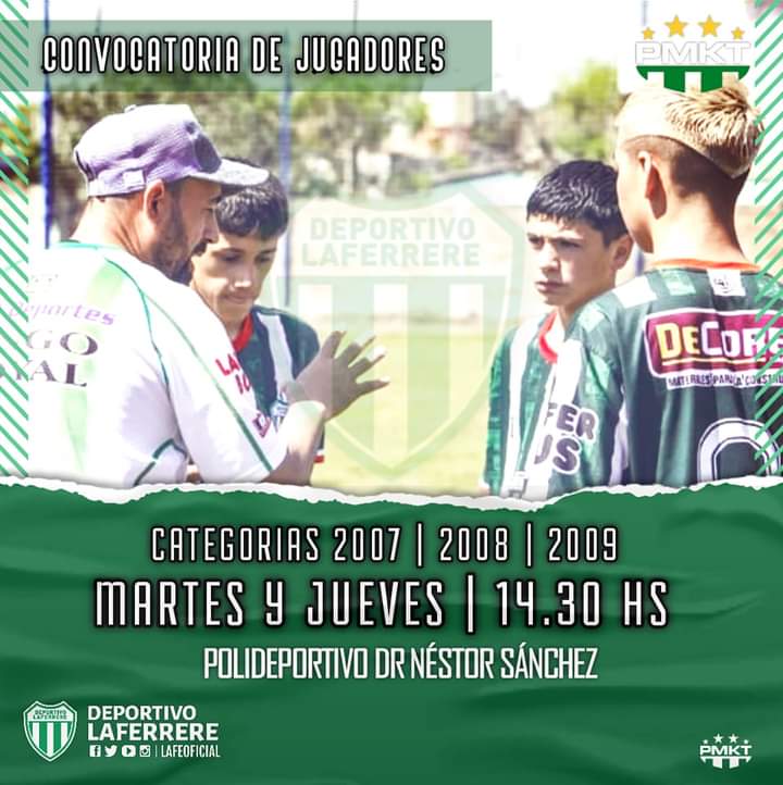 El Deportivo Laferrere anunció que los próximos días martes y jueves se realizará prueba de jugadores, de las categorías 2007, 2008 y 2009, en el Polideportivo Laferrere Dr Néstor Sánchez, en la calle Cristiania y Ruta Provincial 21, localidad de Ciudad Evita
