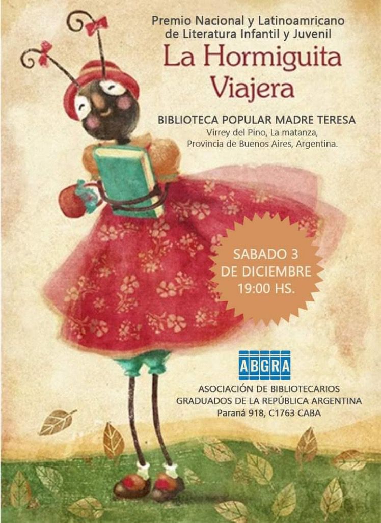 Este sábado 3 de diciembre a las 19 hs se realizará la entrega del Premio Nacional y Latinoamericano de Literatura Infantil y Juvenil a el libro «La Hormiguita Viajera».