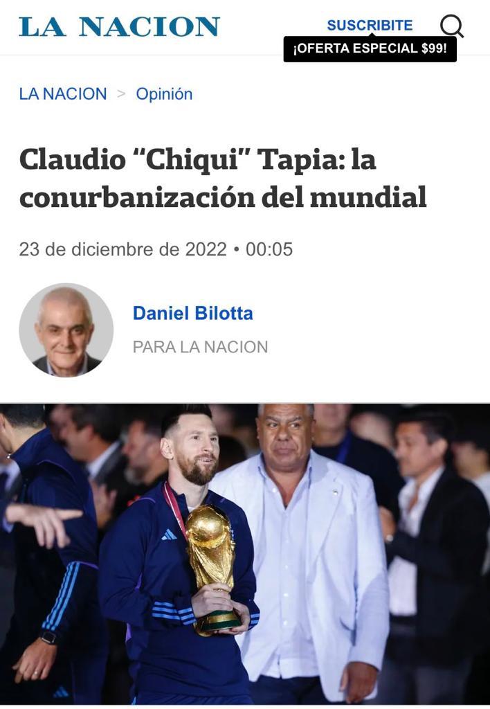 “Nunca llama la atención la utilización clasista del término «conurbanización» por parte del ex diario La Nación.Podríamos volver sobre el aporte del conurbano al PBI nacional, hoy que está tan en boga la discusión sobre el reparto de la riqueza y la coparticipación.Sin embargo, sólo por esta vez, vamos a hacernos cargo de la conurbanización del mundial, aprovechando que en el cuerpo de la nota no hay ninguna referencia al conurbano, más allá de los prejuicios propios de una aristocracia venida a menos… o a más bien nada. Sí, el mundial se conurbanizó. Porque ese penal del final lo pateó un pibe de González Catán. Porque metieron pierna pibes de Calzada, de Sarandí, de Tres de Febrero, de San Fernando. Porque festejaron todos juntos bailando una cumbia ante la mirada de jeques y millonarios.Y sobre todo, se conurbanizó porque la copa, como en la historia de la virgen de Luján, se quedó tres horas entre Ezeiza y La Matanza y no se quiso ir de ahí.Sí, el mundial se conurbanizó. Y menos mal que así fue. Porque aquello que le da alegría al pueblo no puede quedar en manos de quien lo odia».