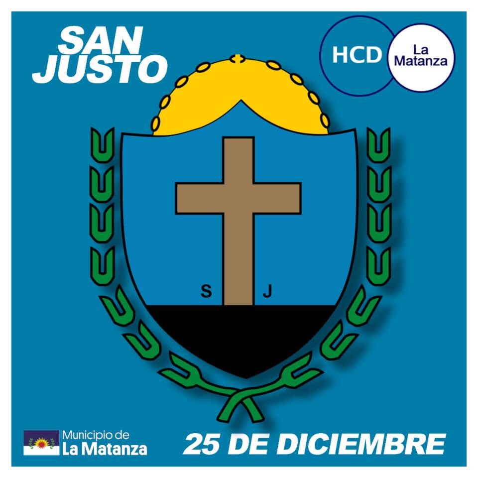El escudo de la Ciudad de San Justo nos muestra el olivo y el laurel de los costados en los que simboliza la eternidad y la gloria de los orígenes de su nacimiento. La gran cruz marrón que está en el centro nos habla del sostenimiento del Partido. El fondo negro del quinto inferior el principio de San Justo por las tierras que se donaron y se remataron. Las cadenas que se quiebran, la rotura entre dos épocas. El celeste del fondo es la ausencia de contaminación. El marrón, el leño de la fuerza telúrica que nos mantuvo firmemente unidos y el amarillo de la parte superior, el sol, de su grandeza como Partido y las iniciales S.J., San Justo.