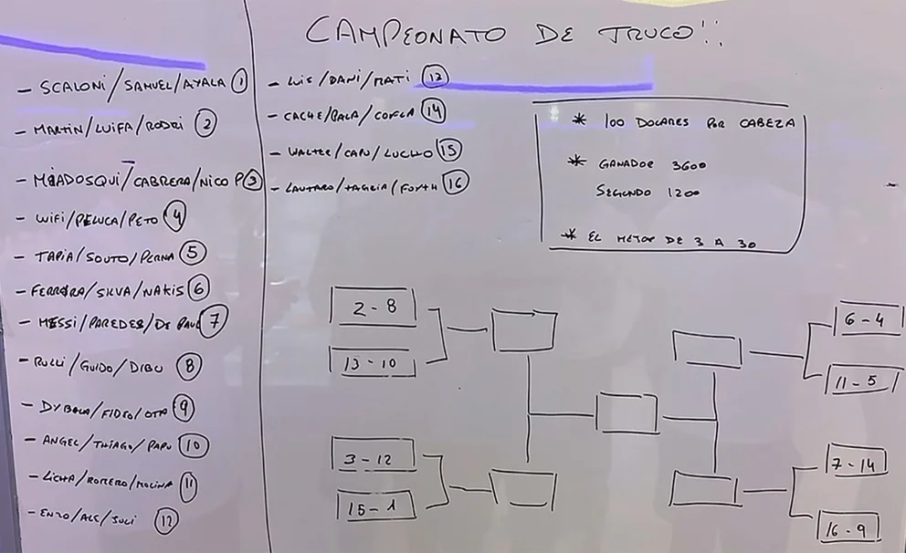 No es una exageración si se asevera que el torneo de truco es uno de los acontecimientos más esperados en la intimidad de la Selección. Sólo un puñado no participó en Qatar, por diversos motivos: Pablo Aimar, Gernán Pezzella y Marcos Acuña integran ese grupo. Al Huevo, por caso, no le atraen demasiado los juegos de cartas. Eso sí, ninguno estuvo ajeno a sus alternativas y prolija organización, al punto que el 20 de noviembre, dos días antes del debut ante Arabia Saudita, ya estaban determinados el fixture, el costo de inscripción (100 dólares por cabeza) y el formato. Sólo ante aquel inesperado tropiezo frente a los asiáticos sufrió jornadas de pausa.