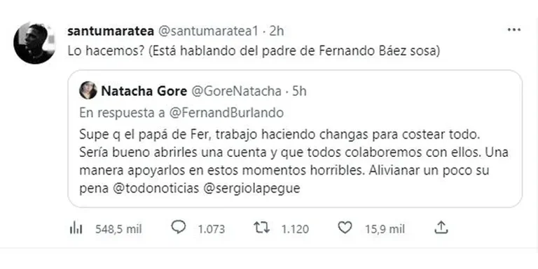 Se trata de un tweet de un usuario llamado Natacha Gore que decidió escribirle a Fernando Burlando, el abogado de la familia Báez Sosa. “Supe que el papá de Fer trabajo haciendo changas para costear todo. Sería bueno abrirles una cuenta y que todos colaboremos con ellos. Una manera de apoyarlos en estos momentos horribles, aliviar un poco su pena”, dice el tweet de la joven, que llegó a oidos de Marate y decidió retrucar la apuesta.