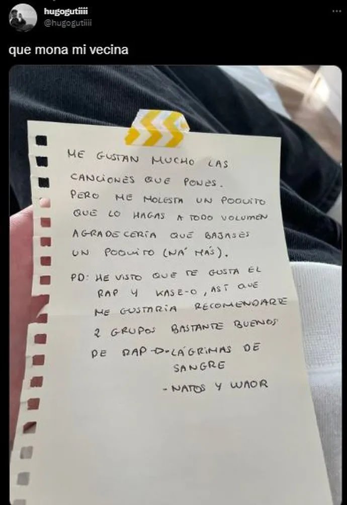 Una inquilina se «quejó» de la música fuerte de su vecino con una desopilante nota que se volvió viral en TwitterUna inquilina se «quejó» de la música fuerte de su vecino con una desopilante nota que se volvió viral en TwitterTwitter: @hugogutiiii