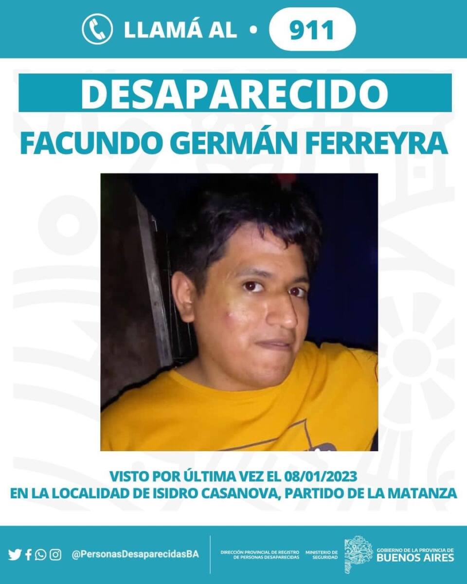 Se trata de Facundo Germán Herrera, de 27 años, fue visto por última vez el 8 de enero de 2023, en la ciudad de Isidro Casanova, partido de La Matanza. El joven necesita asistencia médica y farmacológica.