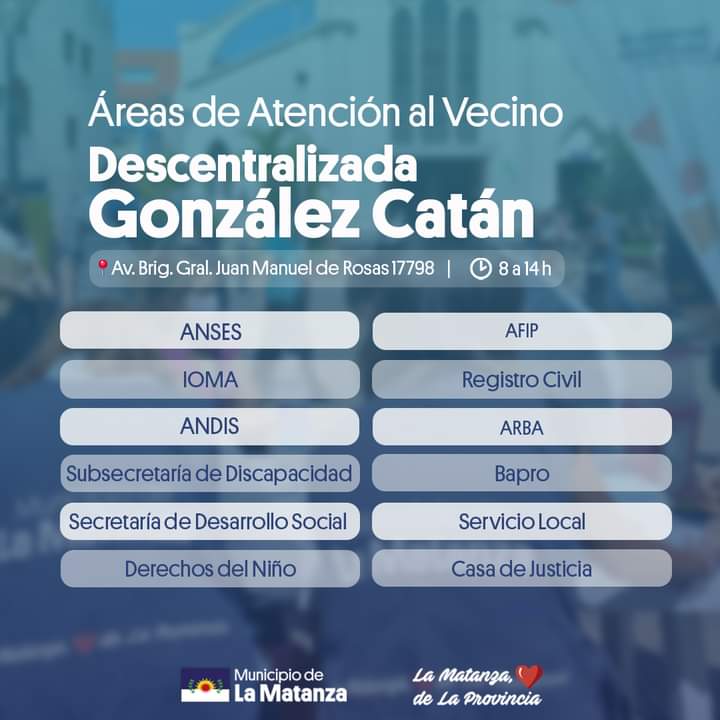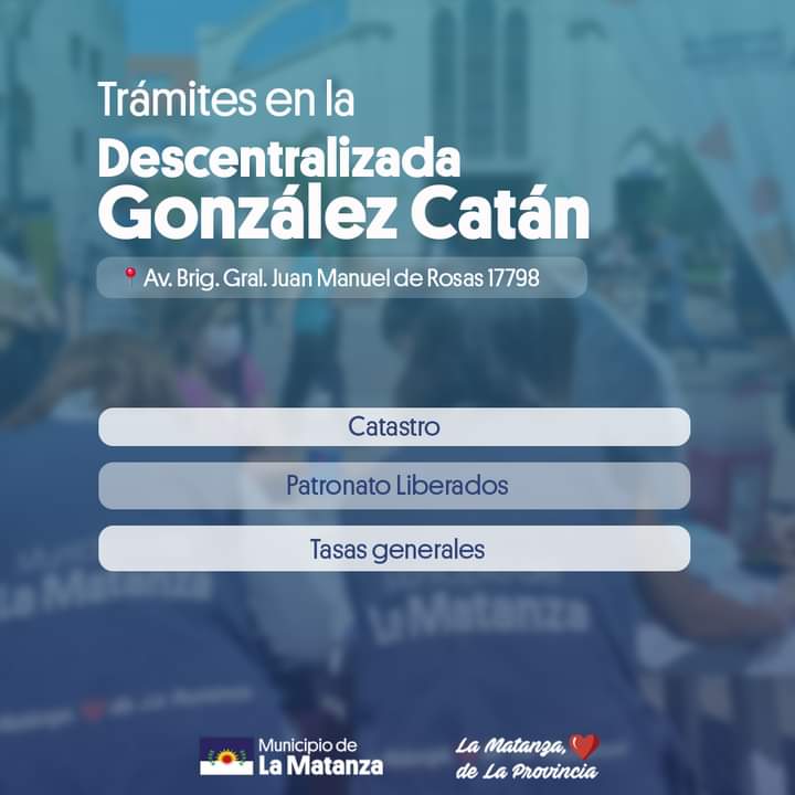 En la oficina Descentralizada de González Catán, ubicada en Av. Brig. Gral. Juan Manuel de Rosas 17798, de 8 a 14hs. se pueden asesorar y realizar los siguientes tramites:
