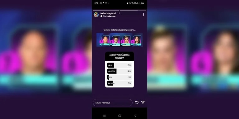 “Vamos con una encuesta pre-salvación: a quien votarías para eliminar si esta fuera la placa final”, comentó el social media manager a través de un tuit. El resultado dio como próximo elimiinado a Ariel, con un 33,5 % de los votos de los usuarios; seguido por Agustín, con 29, 7 %; Daniela, con el 23, 8%; y Lucila “La Tora”, con 12, 9%.