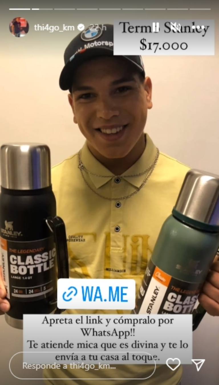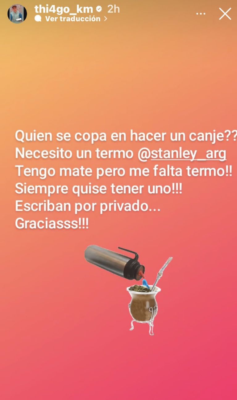 Pese a que muchos lo acusaron de «caradura» por la historia directa que publicó, no le fue mal, ya que gracias a eso pudo conseguir lo que tanto quería. Thiago posó con dos termos premium, dejó el link de WhatsApp e incluyó el costo. El canje que pidió llegó y la cara de felicidad del joven es como la de un niño.