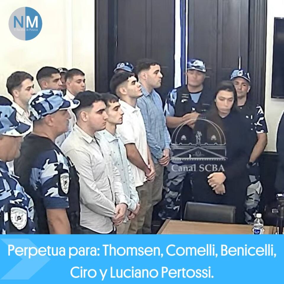 En Dolores, el Tribunal Oral en lo Criminal N1, condenó por unanimidad a prisión perpetua a: Máximo Thompsen (23), Ciro Pertossi (22), Enzo Comelli (22), Luciano Pertossi (21) y Matías Benicelli (23), cómo coautores penalmente responsables por el delito de homicidio doblemente agrabado por alevosía, por el asesinato de Fernando Baez Sosa.