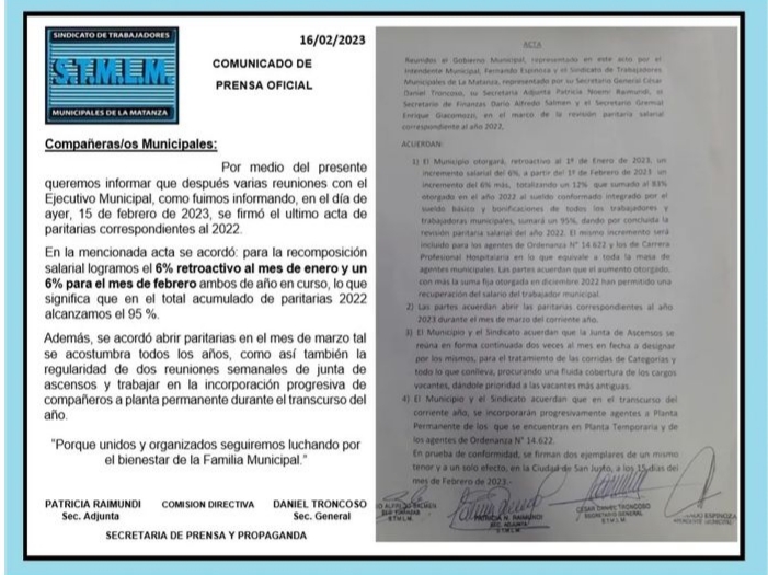 Desde el sindicato de Empleados Municipales de La Matanza (STMLM), informaron que firmaron junto al ejecutivo municipal el acta de las nuevas paritarias.