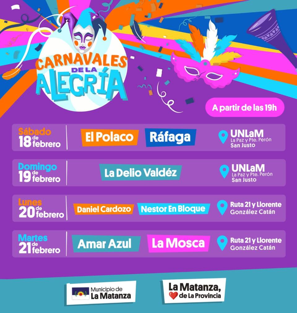 Este fin de semana largo, el municipio de La Matanza, a través de la Secretaría de Cultura y Educación, celebra los Carnavales de la Alegría en La Matanza.