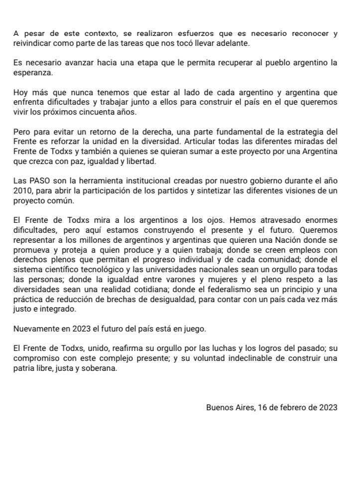 El Frente de Todos, unido, reafirma su orgullo por las luchas y los logros del pasado; su compromiso con este complejo presente; y su voluntad indeclinable de construir una patria libre, justa y soberana.