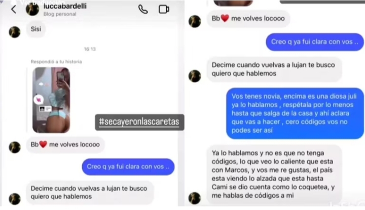 Mientras ella participa en el reality, el joven suele postear mensajes de amor a su novia. Pero ahora él está involucrado en un escándalo por la filtración de supuestos unos chats íntimos con otra mujer. No es la primera vez que lo acusan de ser infiel. En las redes sociales, una joven llamada Rocío Galera publicó un video en el que mostró una supuesta conversación que mantuvo con Lucca a través de Instagram.