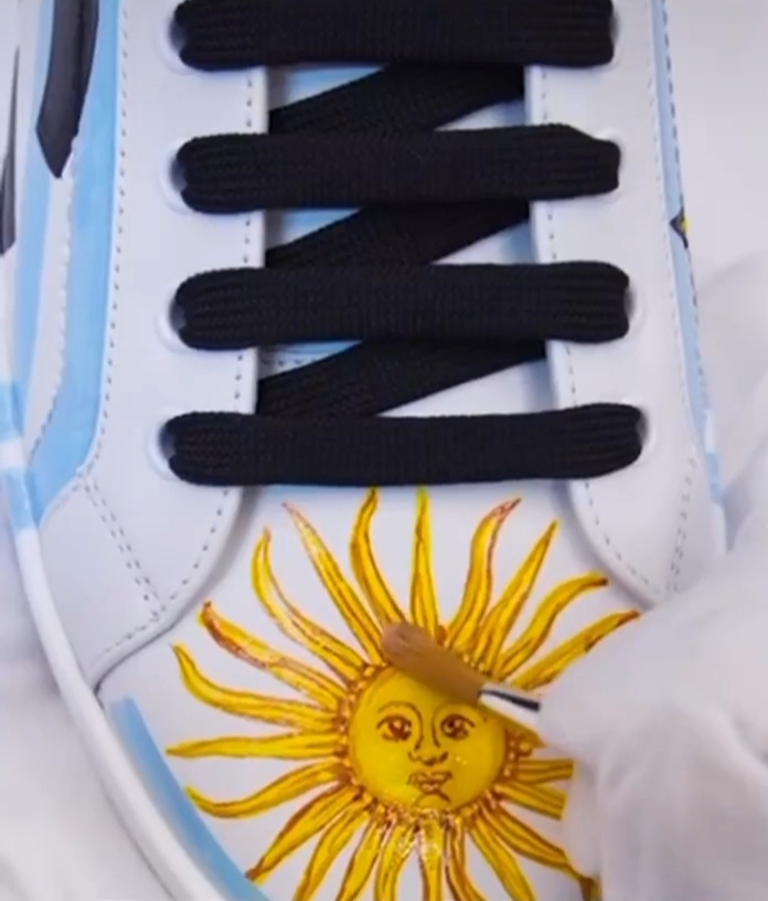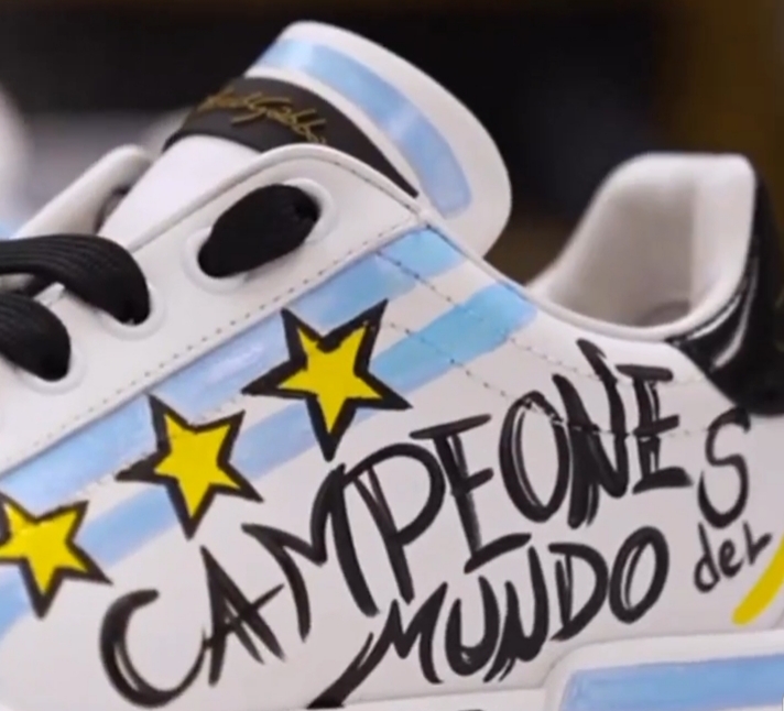 Unas zapatillas con el número 10 pintado, el sol de la bandera argentina y la frase “campeones del mundo“, son el complemento de los diseñadores.