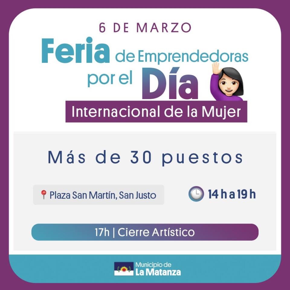 El lunes 6 de Marzo y con motivo de la semana del Día Internacional de La Mujer, habrá una Feria de Emprendedoras en la plaza San Martín de San Justo, frente al palacio municipal.