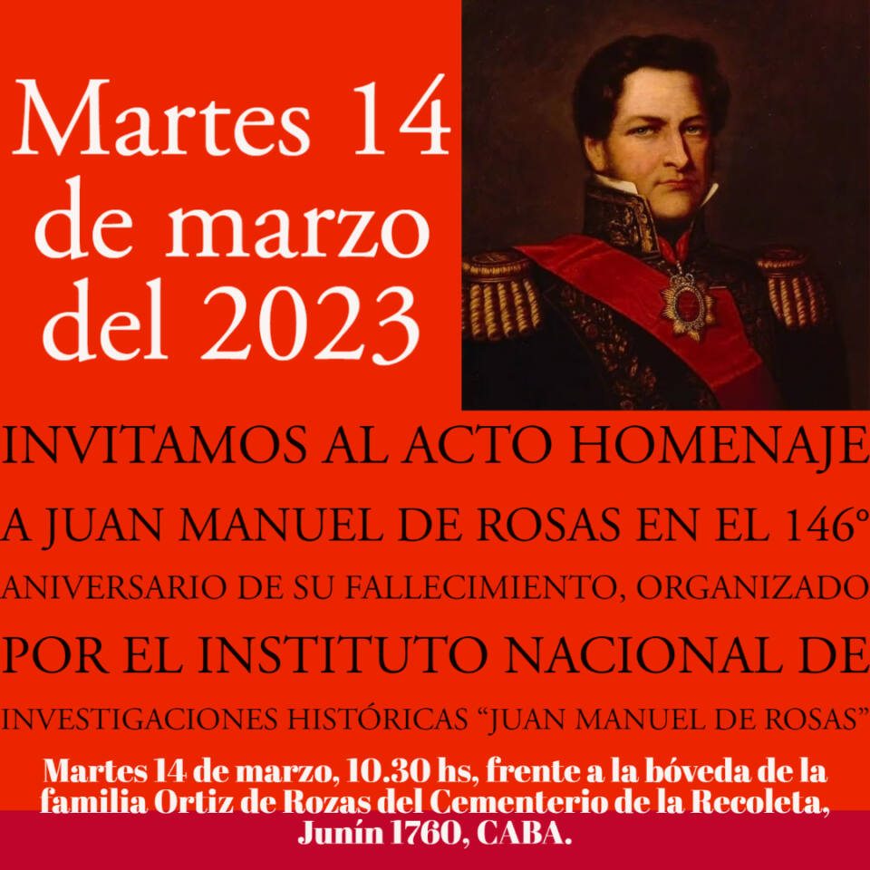 Desde el Instituto Rosas expresaron: «Invitamos al Acto Homenaje a Juan Manuel de Rosas en el 146° aniversario de su fallecimiento, organizado por el Instituto Nac. J. M. de Rosas».