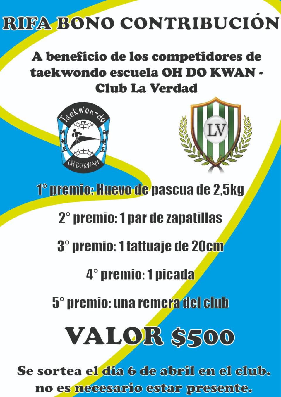 Además, Tiago quién es Campeón Sudamericano, está juntando dinero para poder viajar al próximo Torneo Panamericano de Taekwondo, que se realizará en el mes de mayo en Mar del Plata y está realizando una Rifa Bono Contribución.