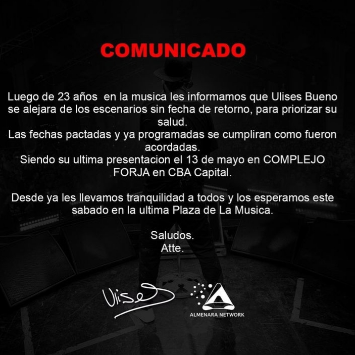 “Luego de 23 años en la música les informamos que Ulises Bueno se alejará de los escenarios sin fecha de retorno, para priorizar su salud”, anunció el comunicado.