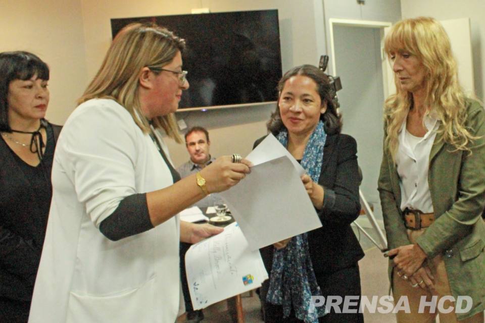 La Presidenta del HCD, Liliana Pintos, emocionada, le brindó la palabra a NELLY BORQUEZ quién, acompañada por Nanci, Cecilia e Isabel,dijo lo siguiente: ”Cuando una empieza hacer un recorrido por la memoria y a vuelo de pájaro, cada persona son como estaciones, como eslabones de una vida de violencia, de sobrevivientes en violencia. Cuando comenzamos no había nada, trabajar por el territorio, ser feminista en sectores populares significa, como dijo Evita, trabajar la necesidad y transformarla en políticas públicas. En este espacio nosotros como sociedad civil pudimos articularlo en la época de los 80 y de los 90 y conseguir un estado alentador con Alberto Balestrini y así empezamos.