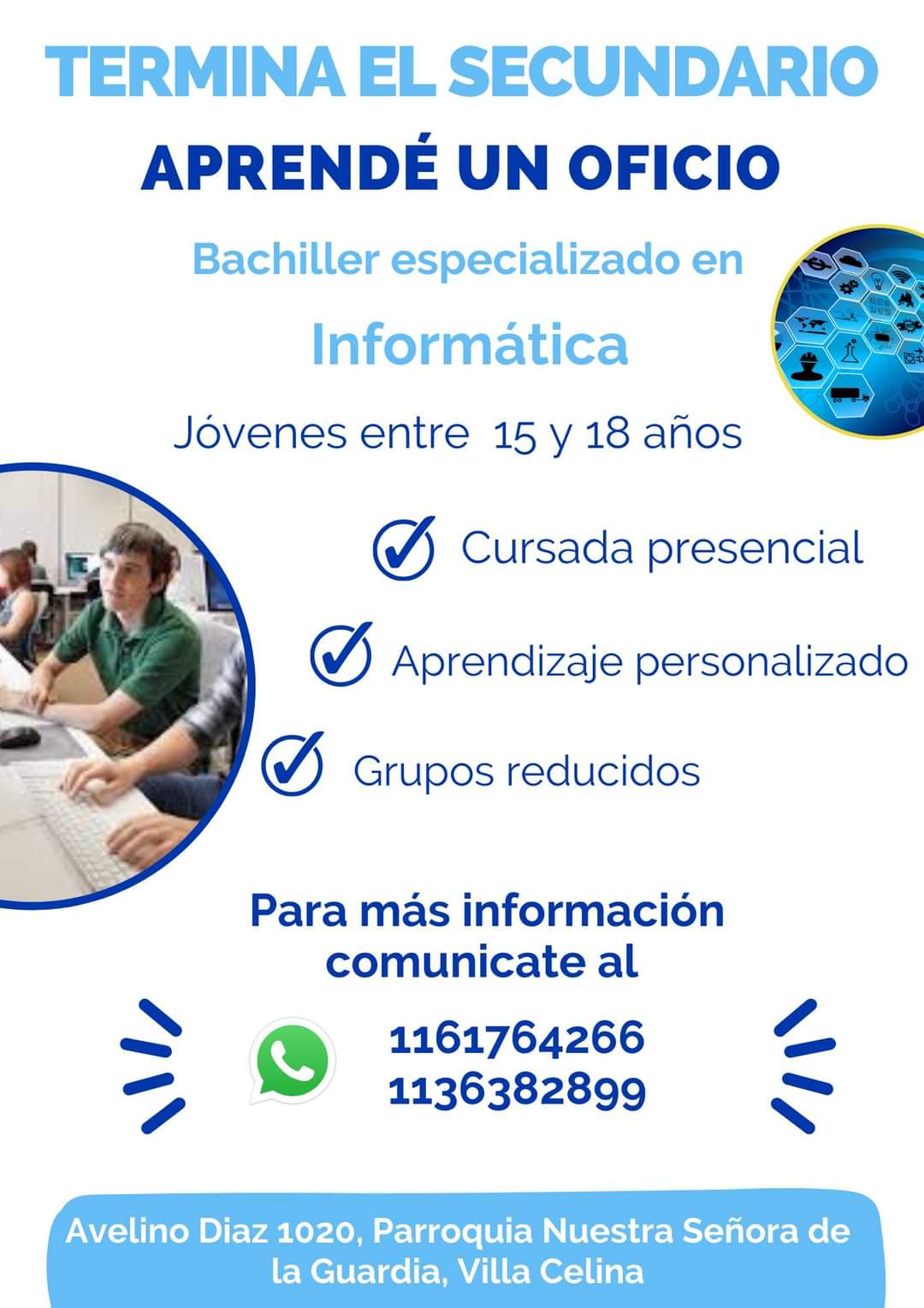 De esta manera, se brinda la oportunidad a jóvenes que no han podido completar su educación secundaria por diferentes motivos. La inscripción no tiene costo alguno y al finalizar los estudios, se otorgará el título de bachiller más los certificados de los oficios cursados, todos avalados por la Dirección General de Cultura y Educación de la Provincia de Buenos Aires (DGCyE)