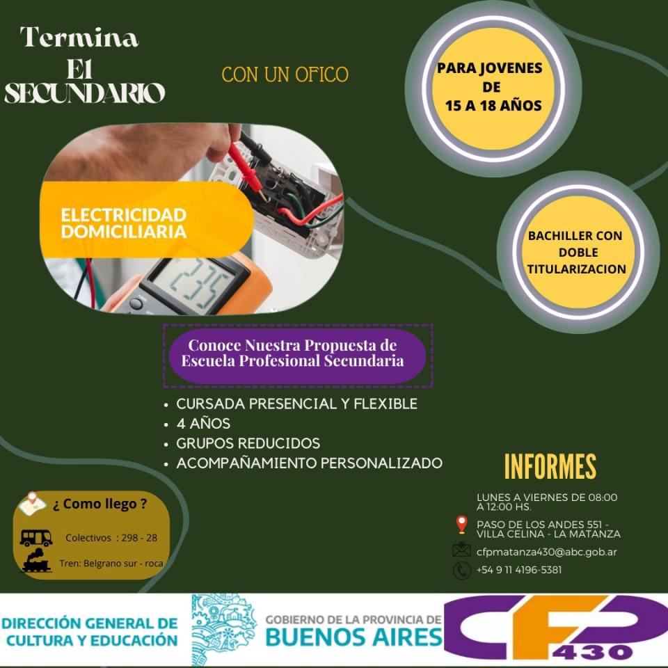 CFP 430. Paso de los Andes 551 (Villa Celina). Lunes a viernes de 8 a 12 hs., tel.: 1141965381