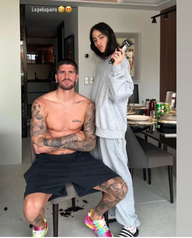 De Paul compartió la imagen en su cuenta de Instagram, donde se le ve sentado en el comedor de su casa con un short deportivo y zapatillas, mientras Tini aparece a su lado con un conjunto de jogging gris y chinelas, sosteniendo una máquina de cortar pelo en su mano izquierda. La foto fue acompañada con el mensaje «La peluquera» y algunos emojis.