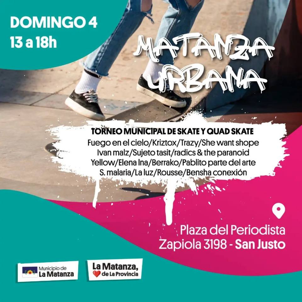 ¡llega la esperada Matanza Urbana! Un festival que reunirá a los máximos exponentes locales del Breaking, Graffiti y la comunidad Skater. Además, contaremos con una Feria de Emprendedores y el Pasillo Cultural, así como bandas y artistas en vivo. Pero eso no es todo, ¡prepárate para presenciar el IMPRESIONANTE TORNEO MUNICIPAL DE SKATE Y DE QUAD SKATE!