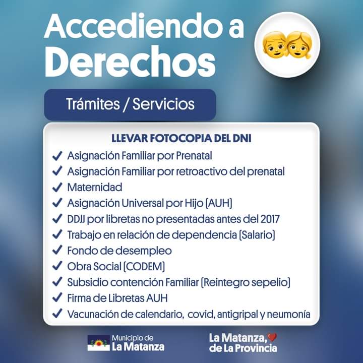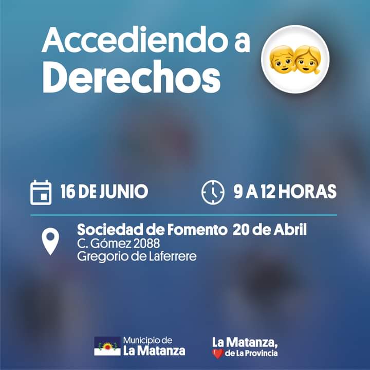 En un esfuerzo por ampliar y reforzar las políticas públicas usadas al acceso de derechos de las familias, la niñez y la adolescencia en el distrito, se llevará a cabo el Operativo Accediendo a Derechos en la localidad de Gregorio de Laferrere, el día 16 de Junio de 9 a 12 hs., en la Sociedad de Fomento 20 de Abril en C. Gómez 2088 de Gregorio de Laferrere.